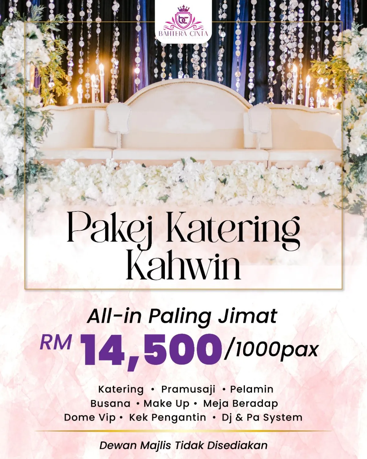 Raikan cinta abadi anda tanpa sebarang kerumitan. Pakej perkahwinan lengkap Bahtera Cinta Catering & Events menawarkan dekorasi memukau, katering lazat, dan perancangan teliti untuk merealisasikan majlis impian anda.